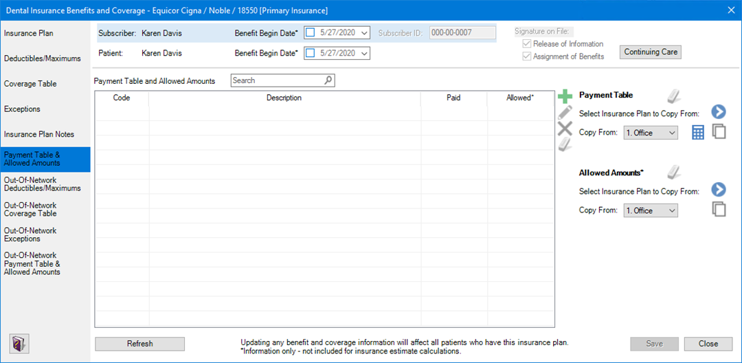 You can use the payment table to enter the dollar amount that an insurance plan pays for specific procedures. As you receive payment from insurance providers, you may update the insurance coverage. The actual payment information is stored in the payment table. You can either enter procedures into the payment table manually, or if you itemize insurance payments, you can update the payment table whenever you post a payment to a claim.