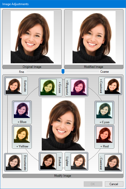 5. Click the sample images in the Modify Image area to increase or decrease contrast and color saturation, make the image lighter or darker, and/or to increase the amount of green, magenta, cyan, red, yellow, or blue.