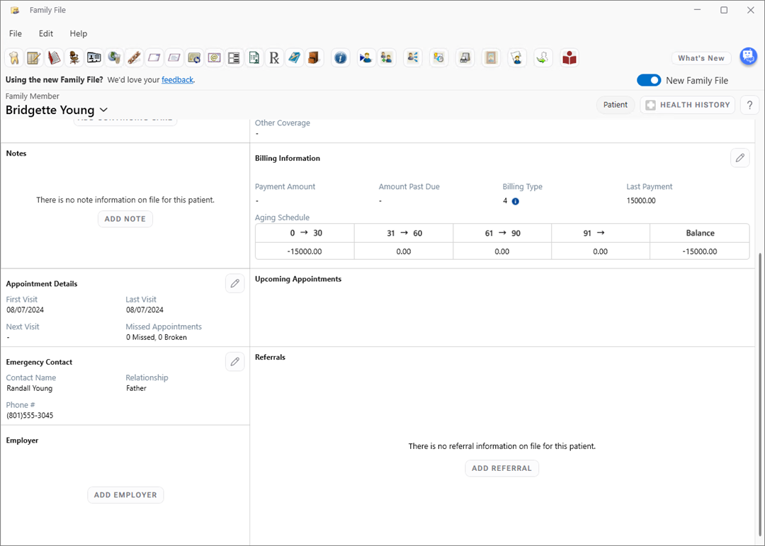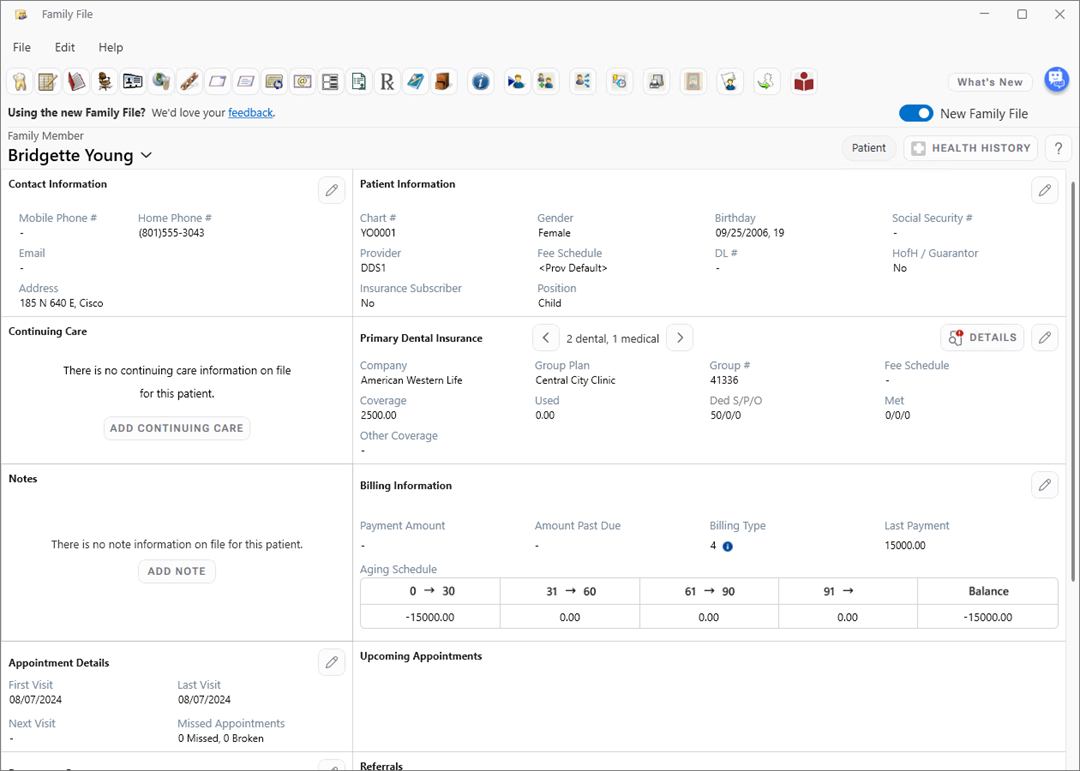 · The new Family File window consists of several cards (Contact Information, Patient Information, Continuing Care, Primary Dental Insurance, and so on).