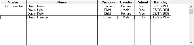 The Family Member List appears at the bottom of the Family File window and displays all members of the family, ordered by birth date. Using the Family Member List, you can easily access each family member's patient information in the Family File.
