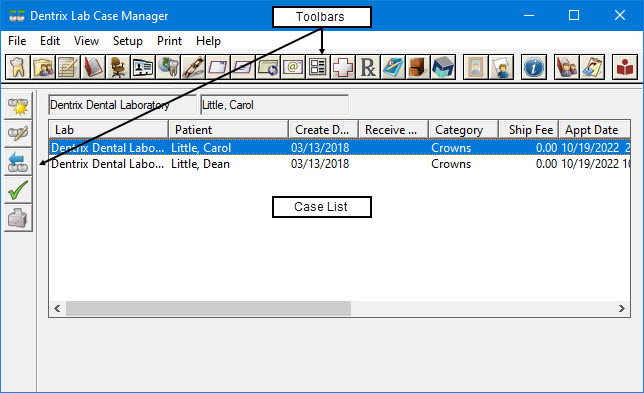 The Lab Case Manager consists of a menu bar and two toolbars. The toolbar under the menu bar contains buttons that can be found in other Dentrix modules. The Lab Case Manager toolbar down the left side of the Lab Case Manager window contains buttons that are specific to the Lab Case Manager.