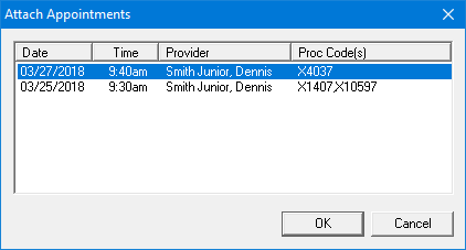 The Attach Appointments dialog box appears with a list of all the appointments for the patient that have not been set complete.