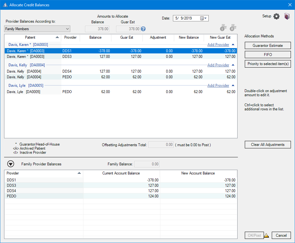 Occasionally, patients may have a credit balance that they need to apply to a procedure. You can allocate credit balances to specify which providers should receive part of an over-payment or a credit after procedures have been entered. You can also transfer patient or provider balances within a family without affecting the aging of the account. You can view and adjust family member and family account balances by provider without changing views in the Ledger. You can transfer balances from archived patients and inactivated providers.