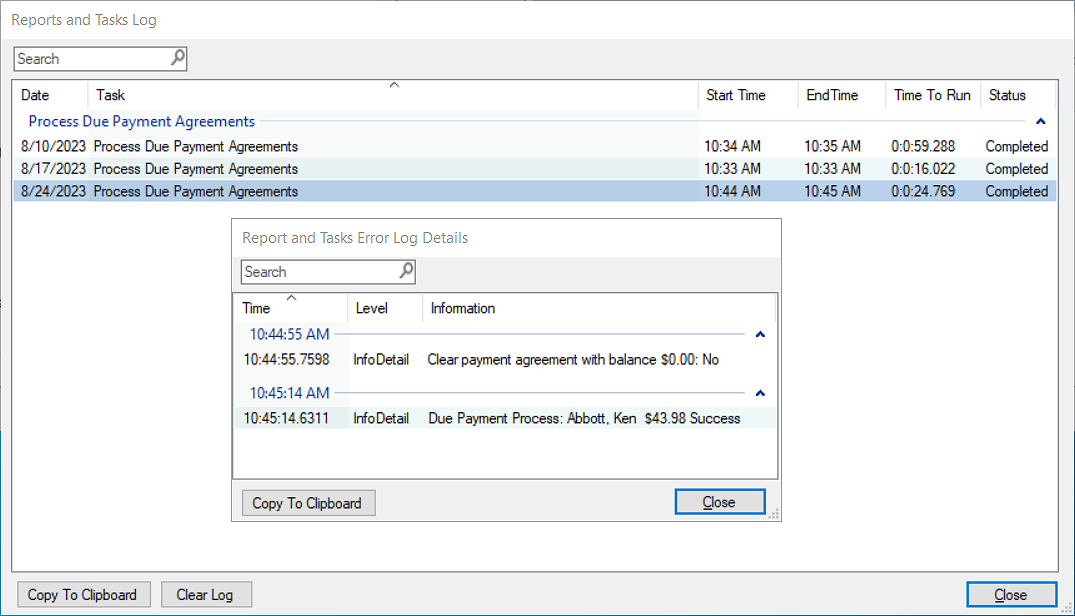 The Reports and Tasks Error Log Details dialog box appears, so you can review the details of payments that processed for due payment agreements when the task ran.