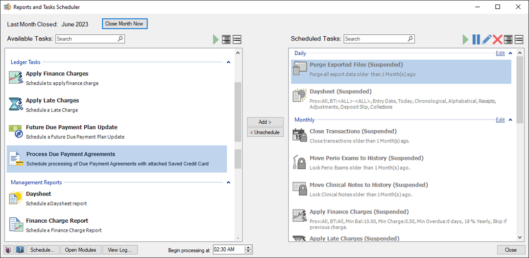 You can set up a task to automatically process due payment agreements that have an attached, saved credit card from the Reports and Tasks Scheduler. Payments are processed for due or past due payment agreements that have an active and attached saved card as of the date the scheduled task runs.