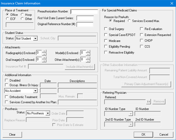 Note: When you enter or clear claim information in a Claim window, the changes only apply to the currently displayed claim and the associated primary, secondary, or medical claim. When you create a new claim, the claim information uses the defaults for the current patient. You can change the defaults for the patient through the Appointment Book. For more information, click Scheduling appointments.