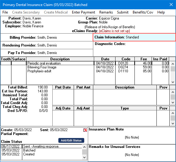 4. Click OK to save your changes and return to the Primary Dental Insurance Claim window.