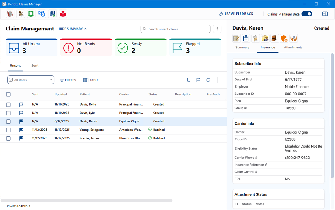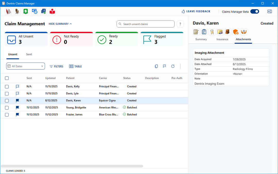 The Dentrix Claims Manager window lists all of your claims and includes toolbars providing you with access to selected Dentrix applications and tools.