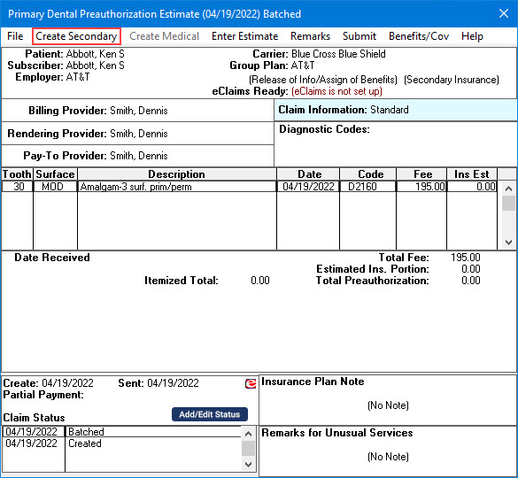 Note: If you have made changes to the patient's secondary insurance plan since creating the primary dental preauthorization estimate, the Create Secondary menu option is not available.