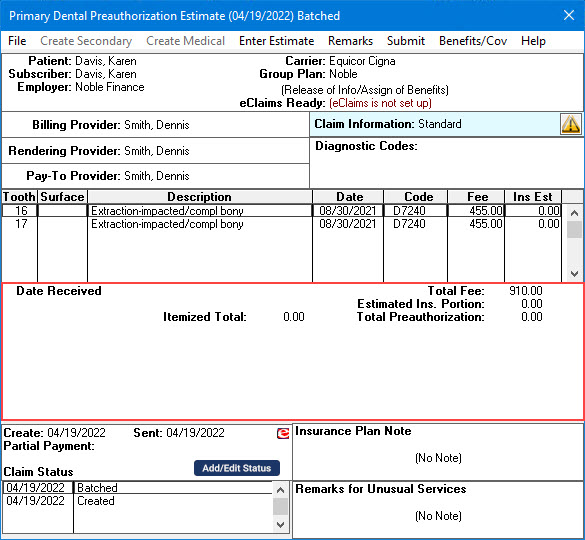 The Dental Insurance Claim or Dental Preauthorization Estimate window appears.