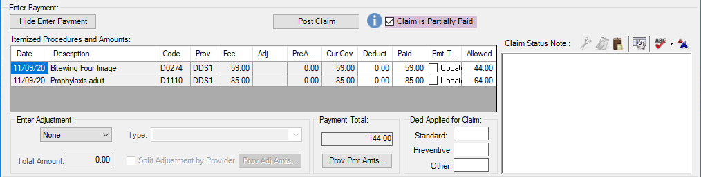 Adj - An amount appears if you selected the electronic payment type in the Insurance Payment area; otherwise, the column remains blank. Dentrix calculates an adjustment for the procedure from the ERA claim.