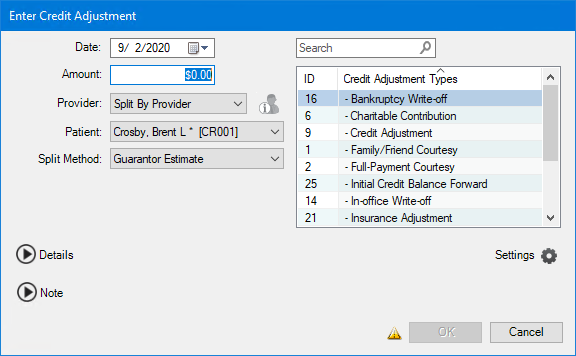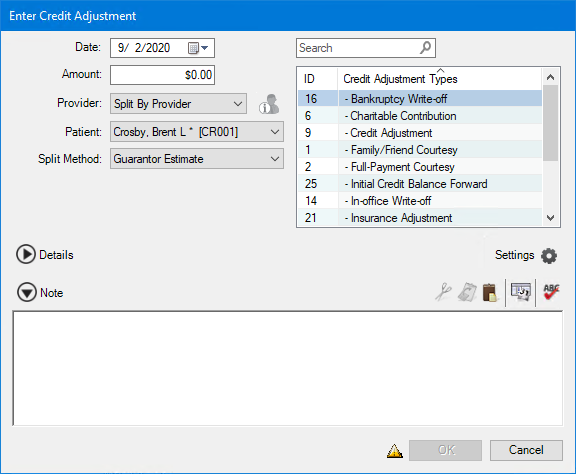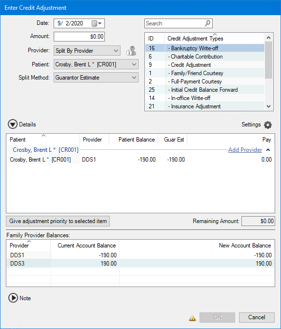 You can make adjustments to change an account's balance for a variety of reasons. Frequently, you will use an adjustment to enter a discount or to indicate that you gave a patient a refund. You can also use adjustments to correct an account's balance when an error has occurred. Like payments, you can apply adjustments to the oldest balance or to a specific patient within the family. You can add and/or modify adjustment types.