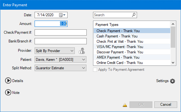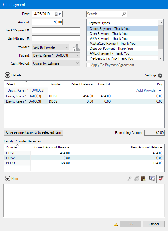 Note: The default is to apply the payment to the selected patient in the Ledger. If you select Split By Family Members, the payment is applied to the oldest family balance and posted to the guarantor's ledger.