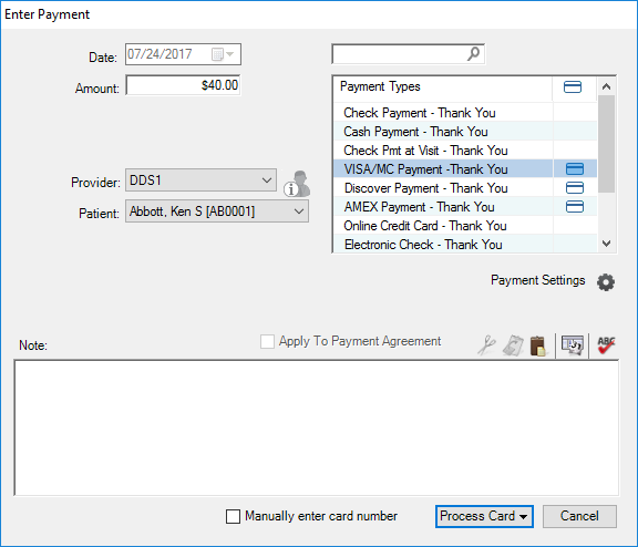 3. Select a payment type that you selected during setup to associate with processing credit cards (indicated by a credit card icon).
