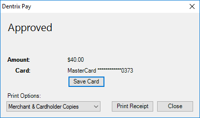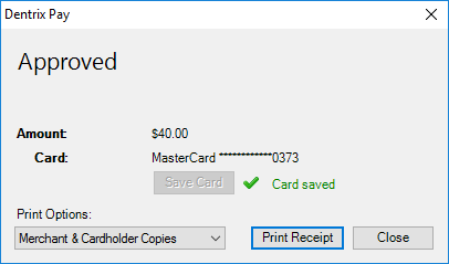 The Dentrix Pay Approved dialog box changes to indicate that the card is saved.