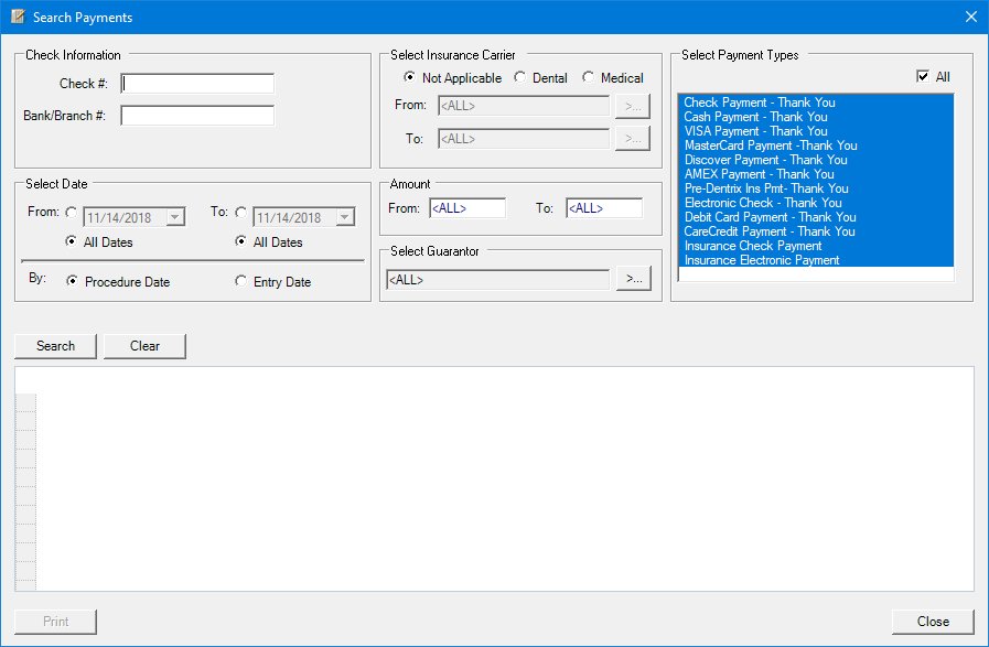 You can use the Search Payments feature to search for payments in the Ledger by check or bank number, amount, payment date, payment type, guarantor name, or insurance name. You can print a report that lists the payments found by the search. Use this feature when you want to search for (and print a list of) any patient or insurance payment, including insurance payments made using the Batch Ins. Payment feature in the Ledger.