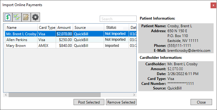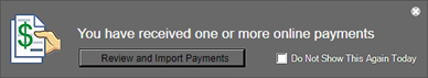 As online payments are successfully processed through the Request to Pay service, they are pushed to Dentrix. If you didn’t select the Automatically import online payments option in the Import Settings dialog box, each time you open the Ledger a notification appears in the lower-right corner of your screen.