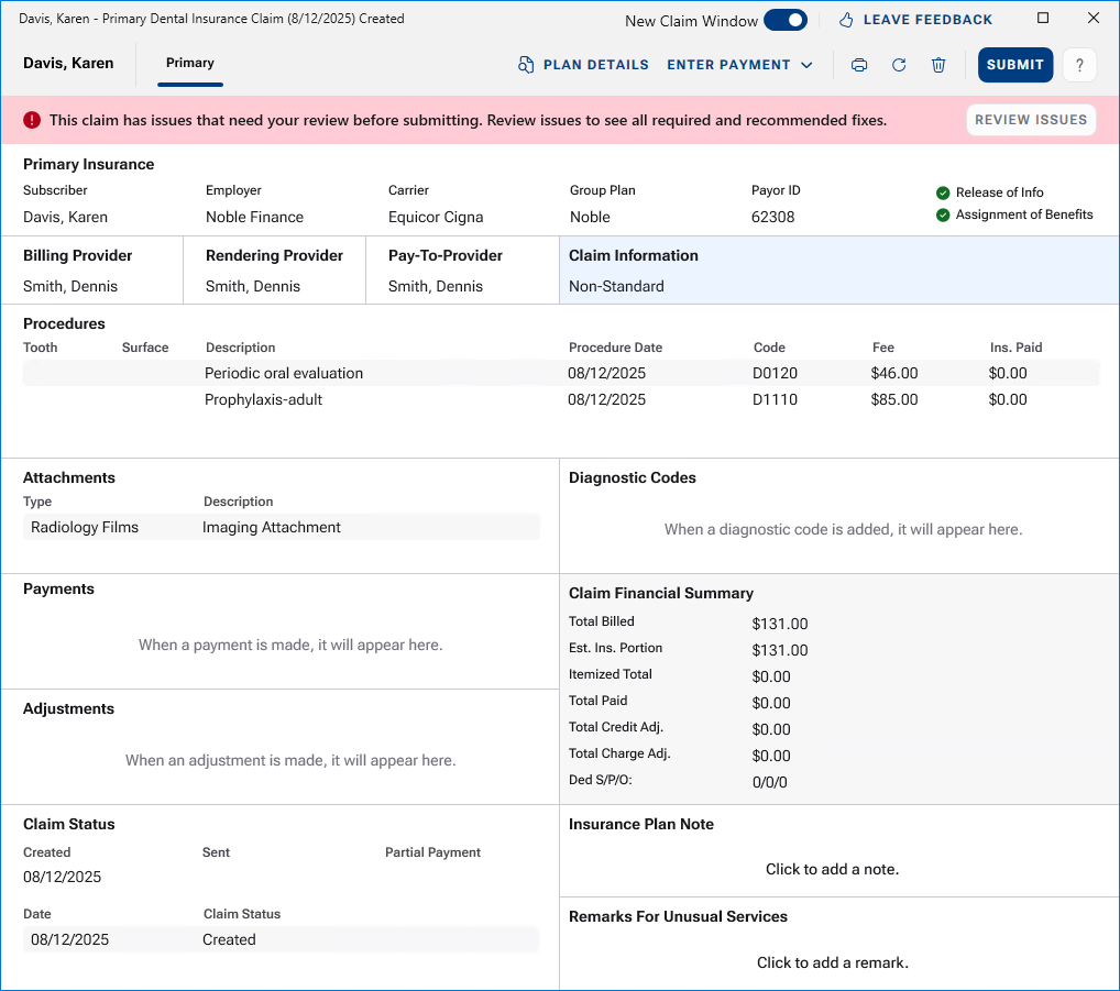 If you have switched to the new claim window, the redesigned Insurance Claim window appears.