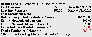 Billing Type - A brief description of the type of billing that will be used to cover payment, such as (1) Standard Billing - finance charges, or (3) Insurance Family - delay finance charges. (Billing Types are defined in the Office Manager.)