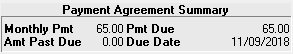 If the patient has set up a financial agreement, the Payment Agreement Summary block of the Ledger window shows information about what the patient has agreed to pay and when.
