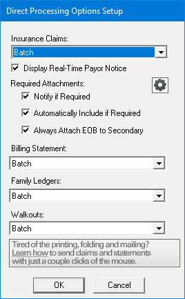 Send Real-time Electronically - (Batch Otherwise) - Submits insurance claims electronically when you set up a payor to process claims in real-time. If you do not set up the payor for real-time claim processing, the claim is sent to the Batch Processor. You must first set up an eServices account to use this feature.