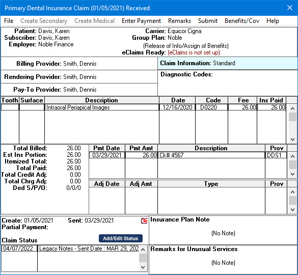 The Primary Dental Insurance Claim Received window appears.