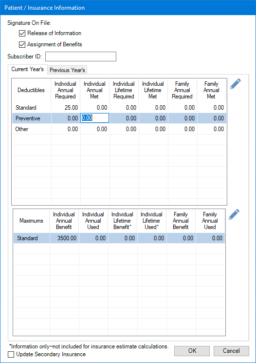 Typically, you will indicate when deductibles have been met when you post an insurance payment, and benefits used and deductibles met for patients are tracked automatically. However, you might have patients who come to your practice mid-year. These patients might have met part or all of their deductibles for the year or used part or all of their maximum benefits.