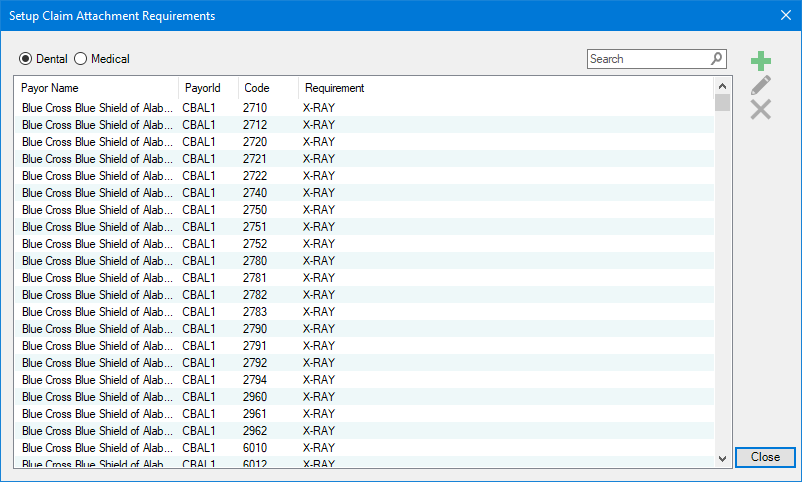 Many of the dental claim attachment requirements have been set up for you. You must add medical claim attachment requirements manually. When necessary, you can add, edit, and/or delete claim attachment requirements by payor.