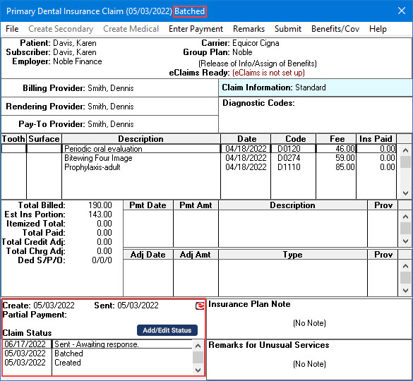Note: The status of the claim appears in the Status box and title bar.