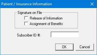 The Subscriber Information block displays the patient, subscriber, employer, insurance carrier, and group plan names. If you selected Release of Information and/or Assignment of Benefits in the Family File, "Release of Info" and/or "Assign of Benefits" appear in parentheses. If the patient has secondary insurance coverage, "Secondary Insurance" is also listed.