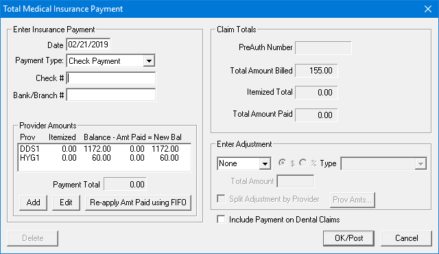 When you post medical insurance payments, you can either post the total payment amount or itemize the payment. If the insurance carrier does not provide you with an Explanation of Benefits (EOB) that shows itemized payment amounts for each procedure, you must post a total payment.