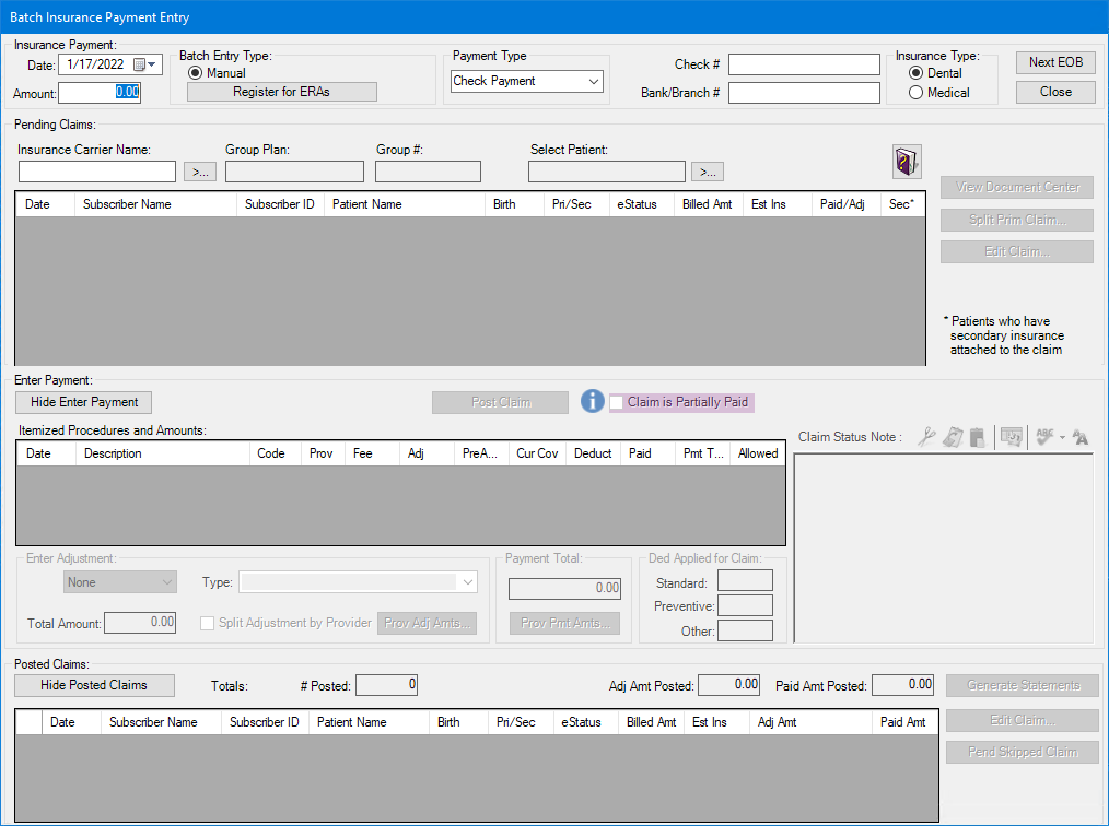 Important: To receive and post ERAs, you must first register with eServices for Dentrix and have Dentrix eClaims installed. You can start the registration process from the Ledger. For complete instructions on how to register, please call 1-800-734-5561 option 2.
