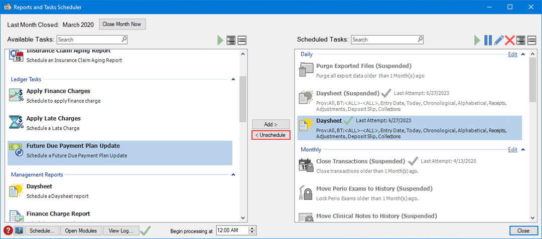Note: Deleting a report or a task removes it from the Scheduled Tasks list, but not from the Available Tasks list. If the report or task you delete is active or scheduled, it still appears in the Scheduled Tasks list but its state is changed to "Suspended."