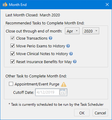 3.   To remove all appointments up to the selected date, under Other Task to Complete Month End, select Appointment/Event Purge, and then set a cutoff date.
