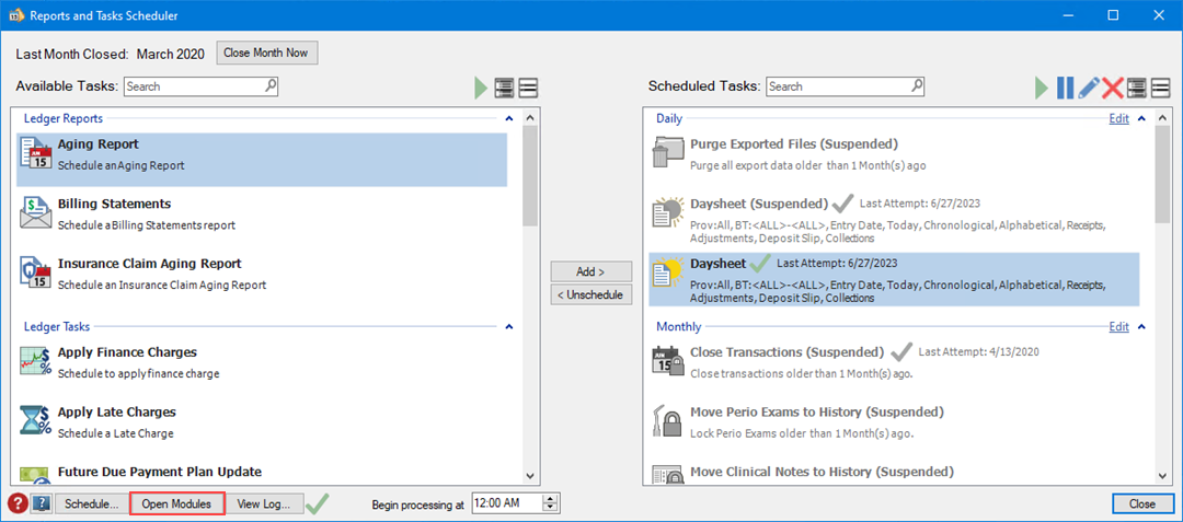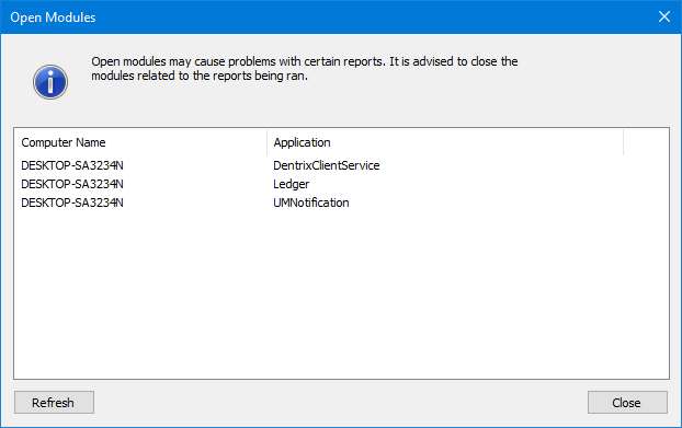 Some month-end tasks won’t run if a Dentrix module is open. You can view which of these modules remains open and on which computer using the Reports and Tasks Scheduler dialog box.