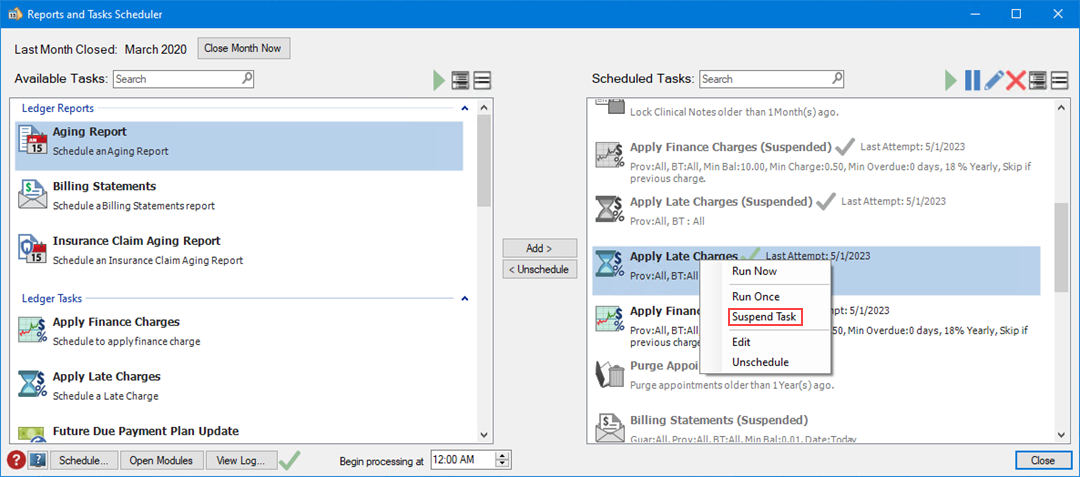 Right-click the report or task that you want to suspend, and then click Suspend Task.