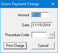 a. If necessary, change the Amount and Date, click the Procedure Code search button, and select the procedure code that will be used to post the down payment charge.