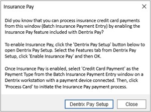 Note: You can also enable Insurance Pay from the Batch Insurance Payment Entry dialog box. If you have set up Dentrix Pay but have not enabled Insurance Pay, when you select Credit Card Payment as the payment type, a warning icon appears to the left of the Last 4 of Card text box. If you click the warning icon, a message appears allowing you to open Dentrix Pay Setup, so you can enable Insurance Pay and process credit card payments from the Batch Insurance Payment Entry dialog box.