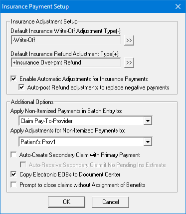 Select a Default Insurance Write-off Adjustment Type (-), such as -Write-Off.