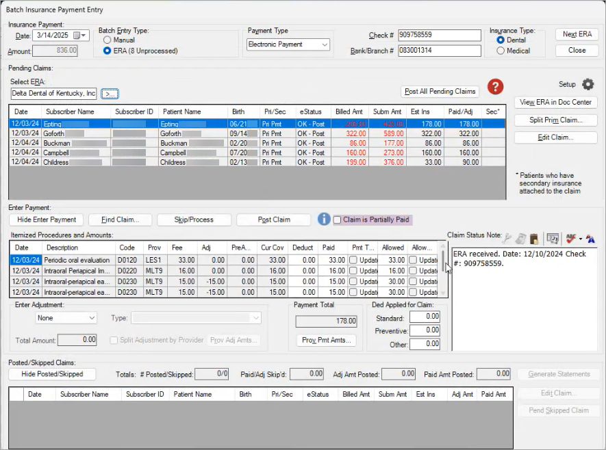 You can select an option to post adjustments to ERAs according to the Ledger fees or the claim billed amount from the ERA in the Batch Insurance Payment Entry dialog box.