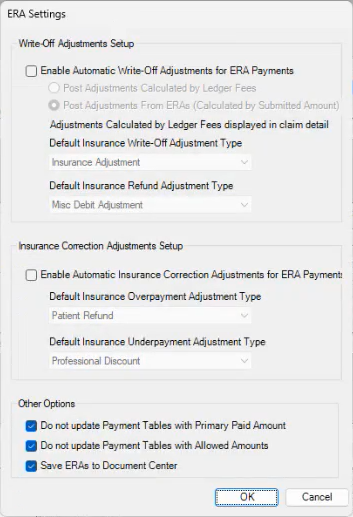 Select Enable Automatic Write-Off Adjustments for ERA Payments, and then select Post Adjustments Calculated by Ledger Fees or Post Adjustments From ERAs (Calculated by Submitted Amount).