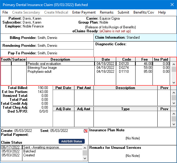 The Procedure Information block lists all of the procedures attached to a claim, including the tooth number, surface, description, date, procedure code, fee, and amount paid.