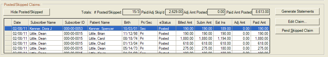 The status of the selected claim is updated to unprocessed, the number in the #Posted/Skipped text box decreases by one, and the amount in the Paid/Adj Skip’d text box decreases by the amount in the Paid/Amt column for the skipped claim.