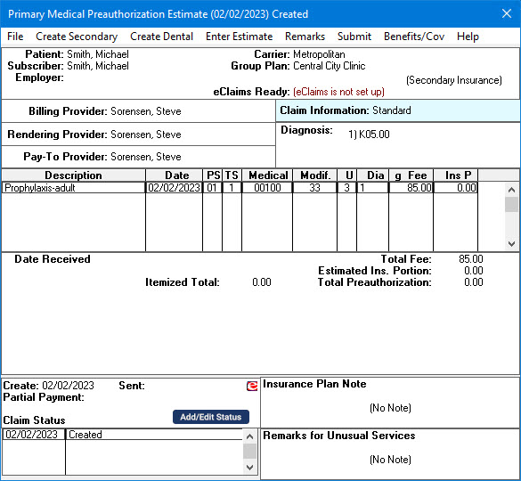 Creating a preauthorization estimate is very similar to creating a claim for completed treatment. To understand how preauthorization estimates are created, click here.