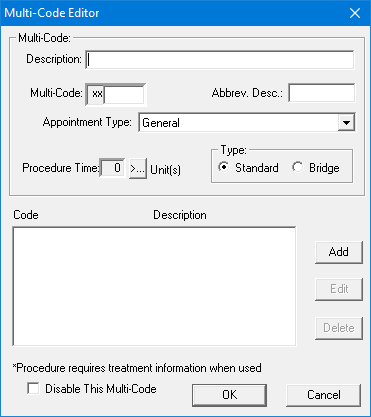 9. When you have finished adding procedure codes, click OK to close the Multi-Code Editor dialog box and save the multi-code you created.