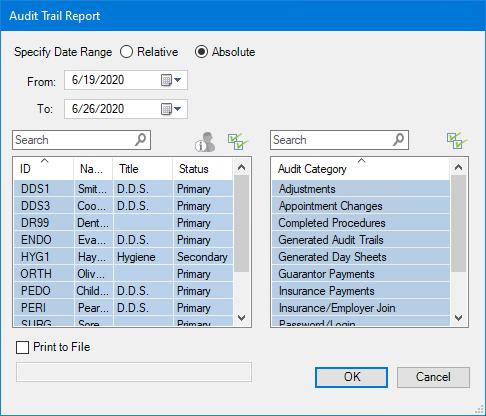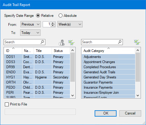 The Audit Trail Reports allow you to print a report of all transaction entries that have been changed or deleted. The Standard Audit Trail Report prints out a report of information regarding any transaction that has been edited or deleted. It can also contain information about changes made to patient's Family File, including: Patient Name, Social Security number, Prov1, Prov2, Chart Number and Billing Type.