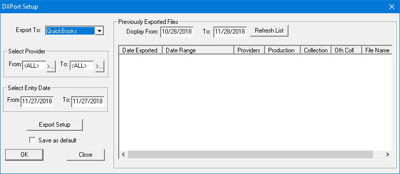 You can export accounting information from Dentrix to use in your accounting software, such as QuickBooks or Microsoft Excel.