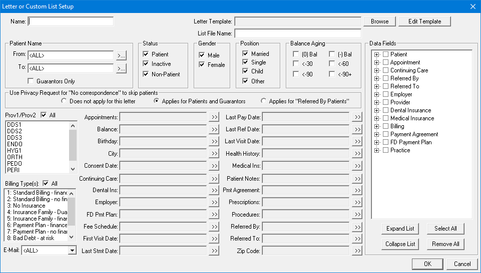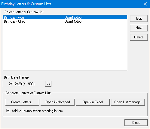 The Birthday Letters & Custom Lists (or other letters type) dialog box appears.