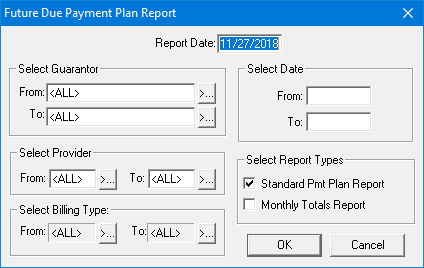 The Future Due Payment Plan Report shows payments that can be expected based on established payment plans. This report includes a range of guarantors, providers, Billing Types, and date ranges you specify. You can also determine whether the report is to be a standard report or a monthly totals report.