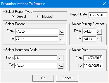 The Pre-authorizations to Process Report contains pre-authorization estimates that have been created in the Ledger but have not been sent to the Batch Processor, printed, or sent electronically. This report includes a range of patients, providers, and carriers you specify. The report also includes the claim date, type (Primary/Secondary) patient name, insurance company name, amount, and expiration date. Additionally, a total of the amounts for primary claims and secondary claims and a combined total prints at the end of the report.